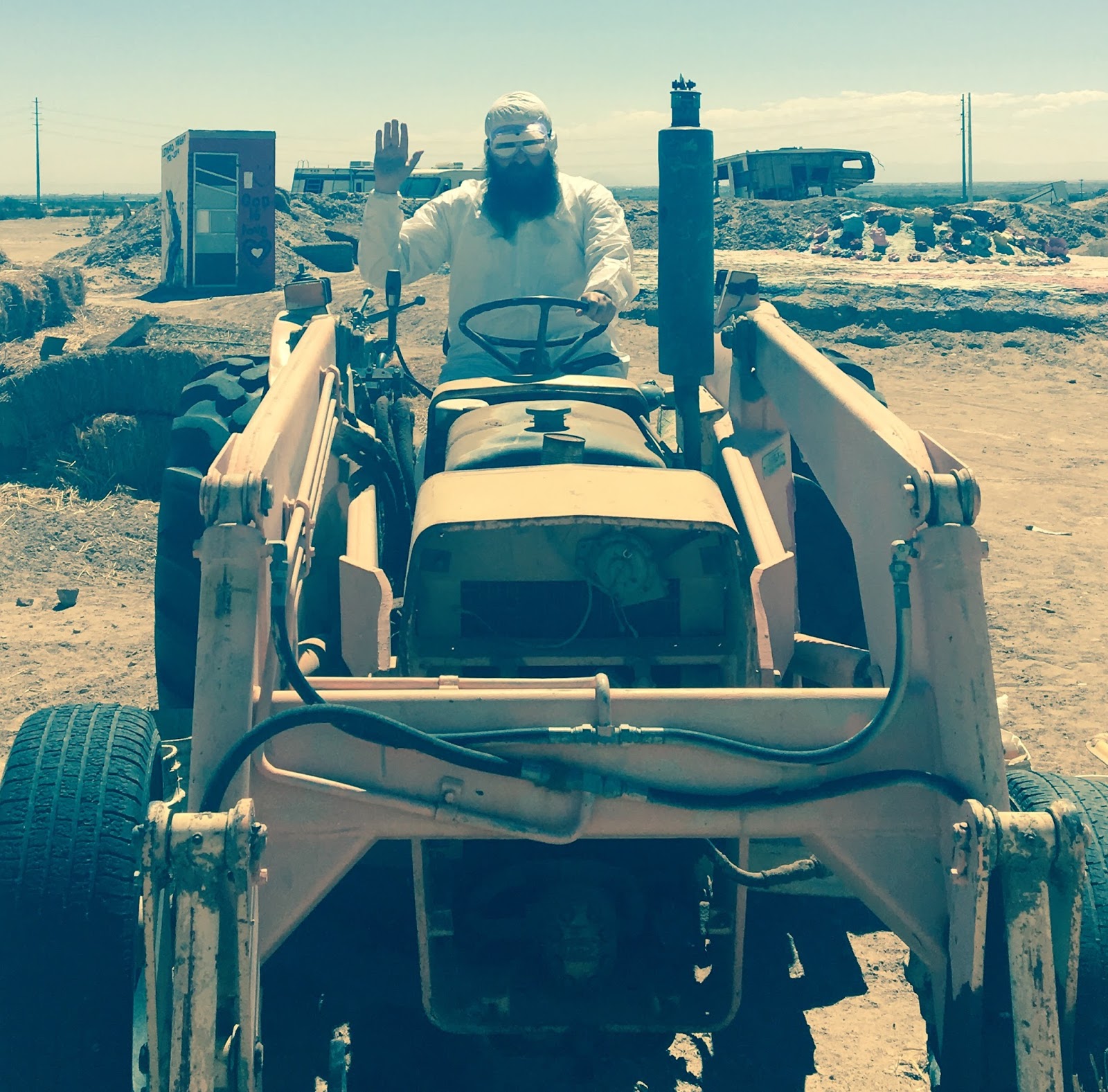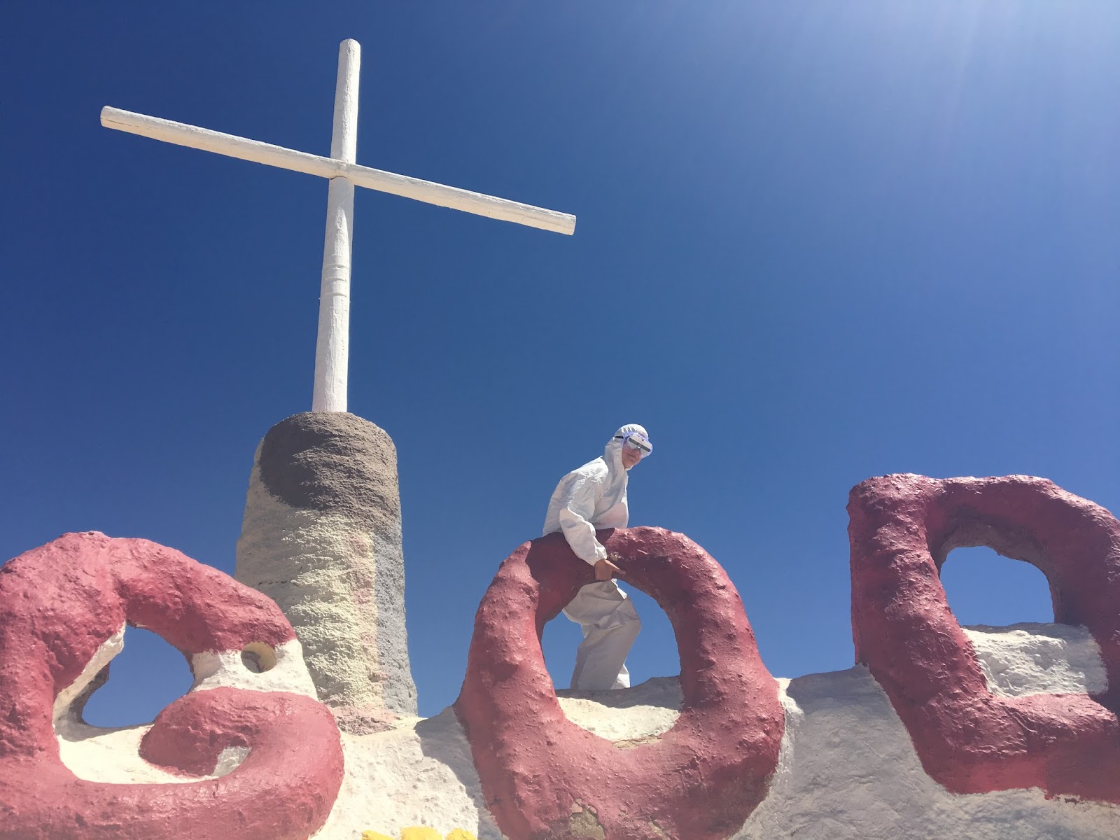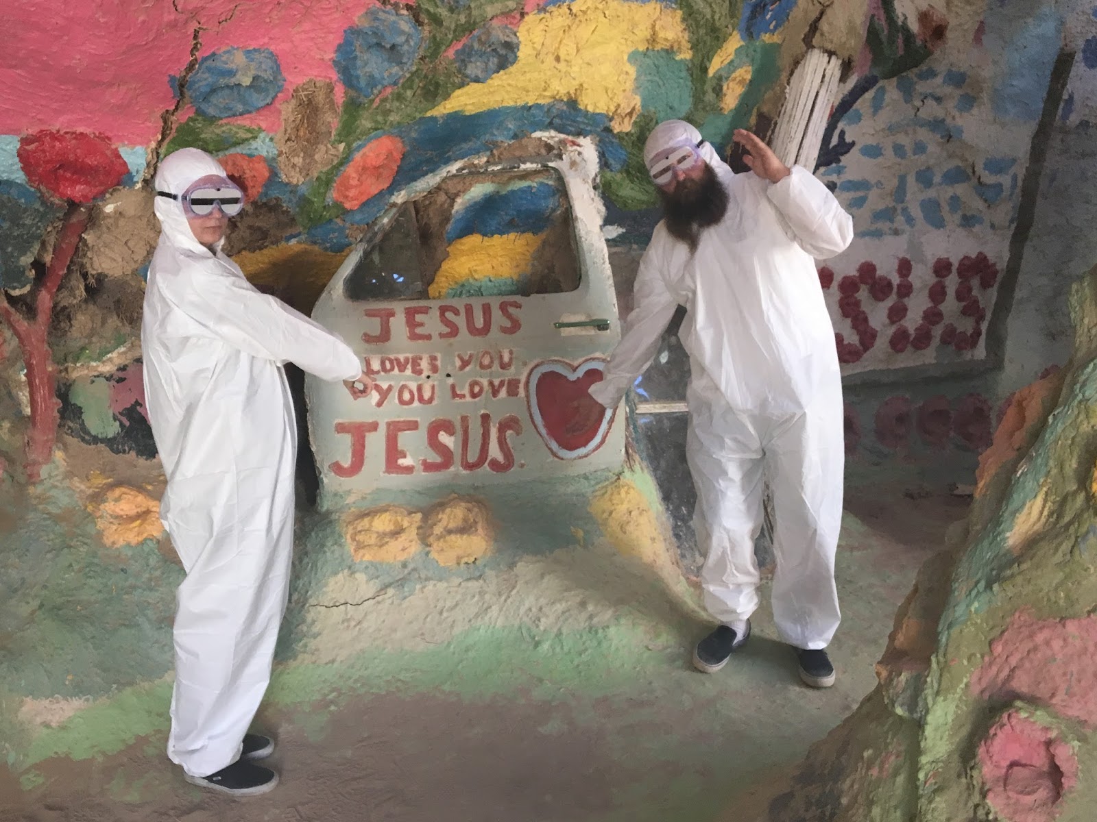 Blazing our trail, we began to spitball a few ideas for heightening our experience at Salvation Mountain; as we flew past a discount store, I suggested that it might be fun to arrive in white sweatsuits and drugstore flip flops, giving the appearance of a cult pilgrimage. Call it pretense, if you must, but I was looking for a way to add a layer of humor to our visit (after all, the